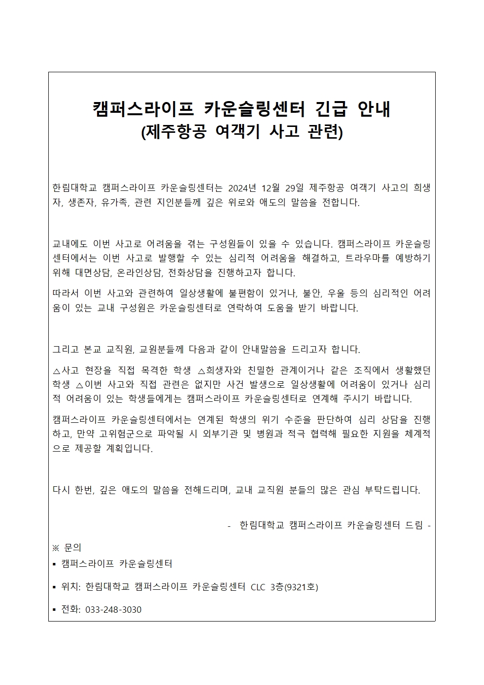제주항공 여객기 사고 관련 심리지원 긴급 안내