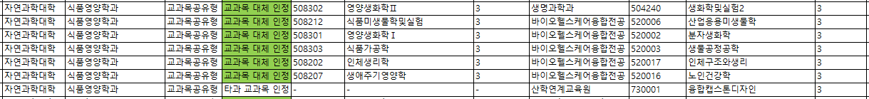 2025-2학기 식품영양학과 코드쉐어링 현황