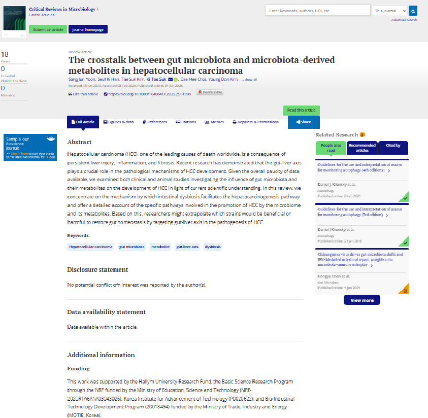 Congratulations to Dr. Sang Jun Yoon  who has been published in Journal of Critical Reviews in Micobiology.
