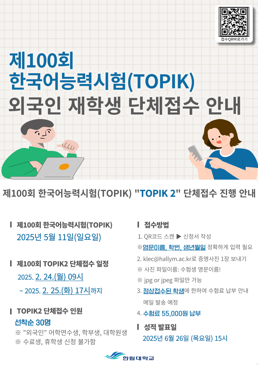 제100회 한국어능력시험(TOPIK) 한림대학교 외국인 재학생 단체접수 일정을 안내드리고자 합니다.