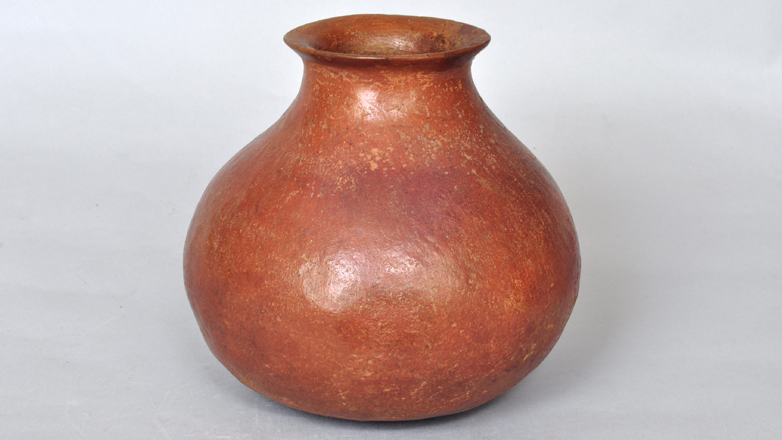 박물관에 전시된 붉은 간 토기 중 목이 짧고 바닥이 둥근 항아리는 출토지는 알려져 있지 않으나, 유사한 형태의 토기가 고인돌이나 돌널무덤 등에서 껴묻거리로 출토되는 경우가 많습니다.