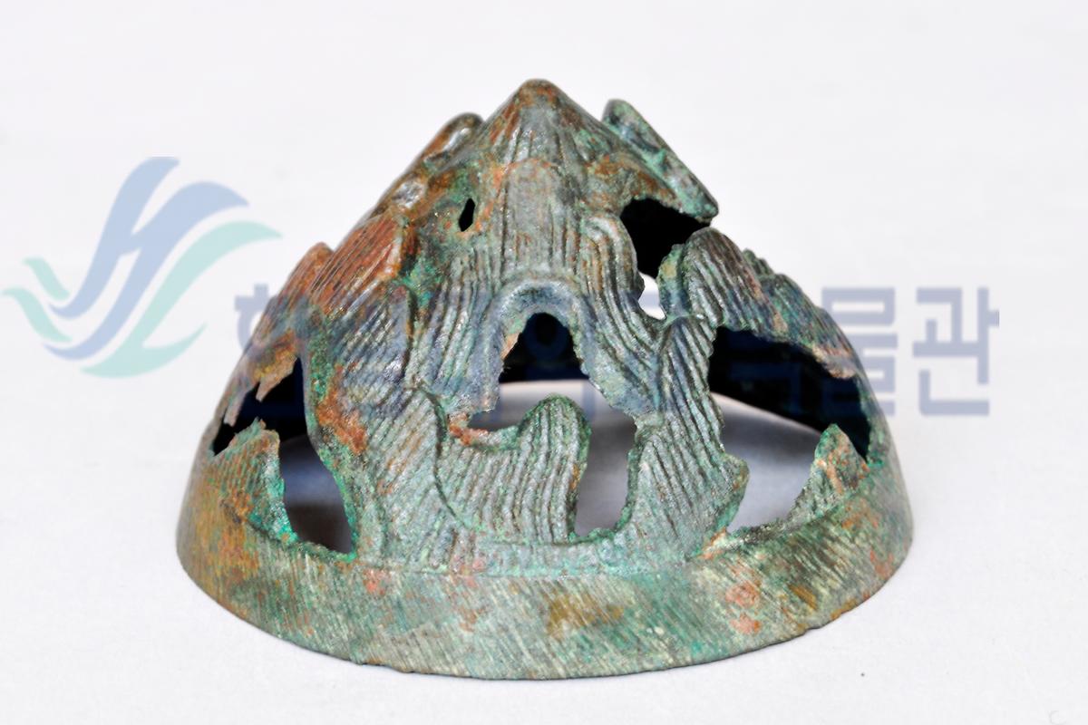 박산로라고 불리는 이 향로의 생김새는 기본적으로 바다를 상징하는 바닥, 그 위에 거북, 큰 새가 순서대로 몸통인 큰 산을 떠받치고 있습니다.
